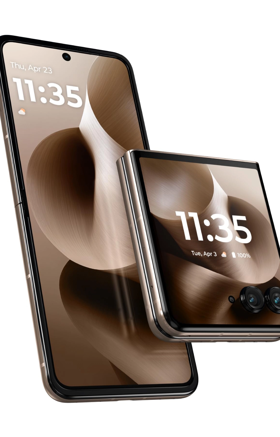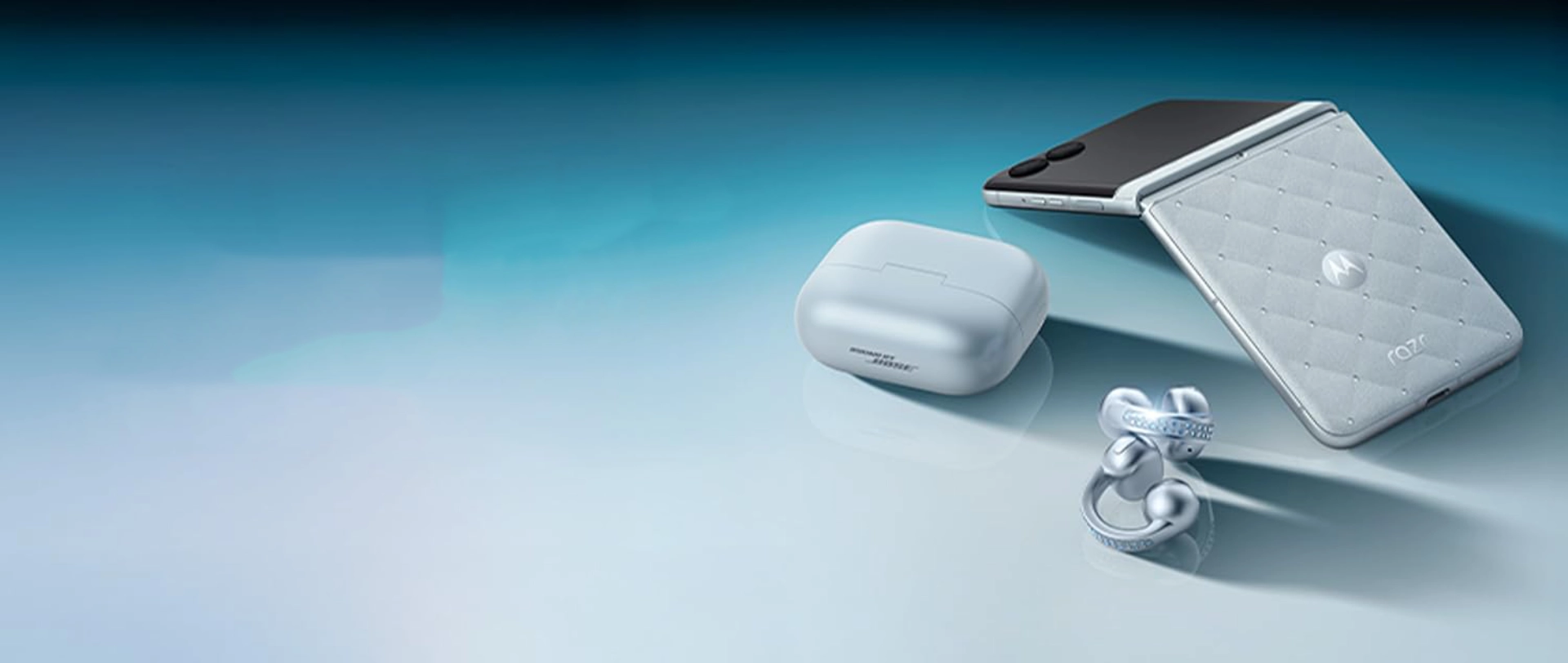 A stylish combo featuring the Motorola Razr 2025 foldable smartphone and Moto Buds Loop, elegantly designed with Swarovski crystals for premium sound and style